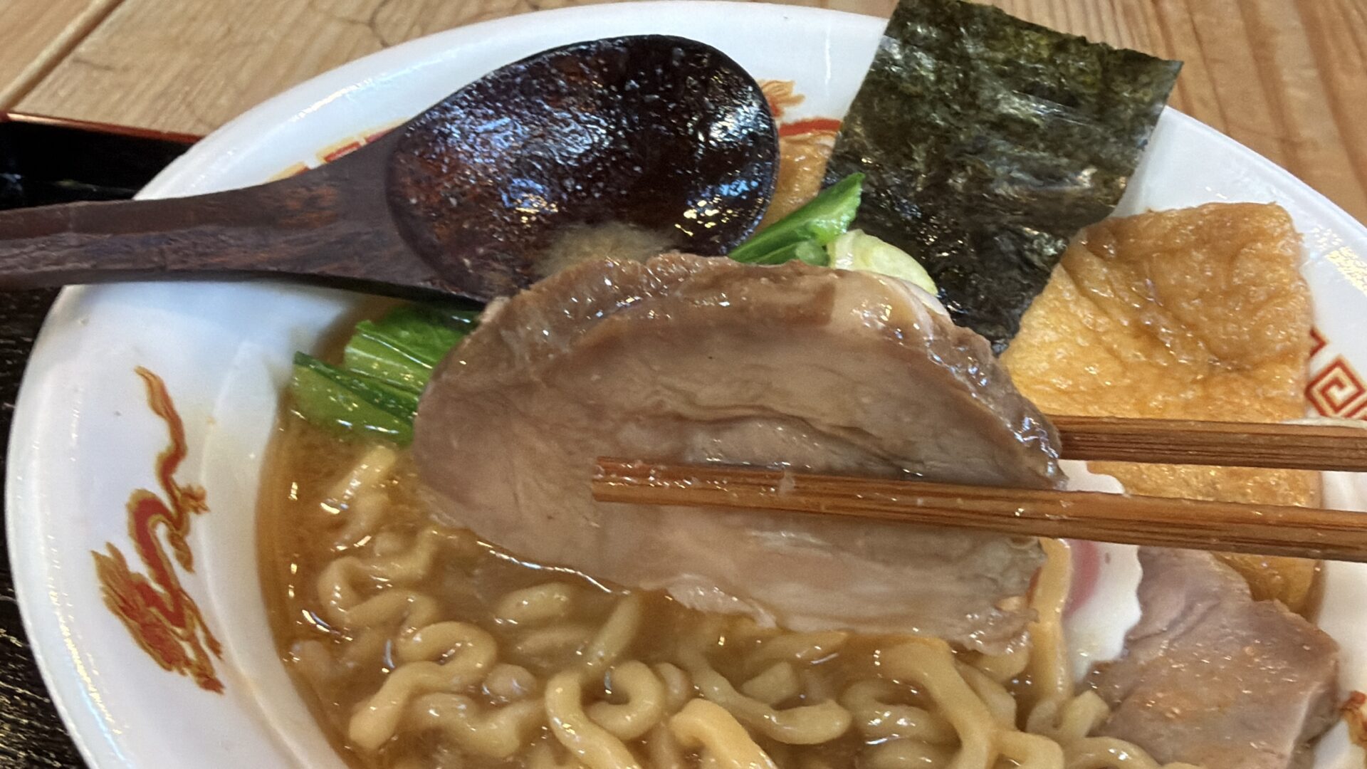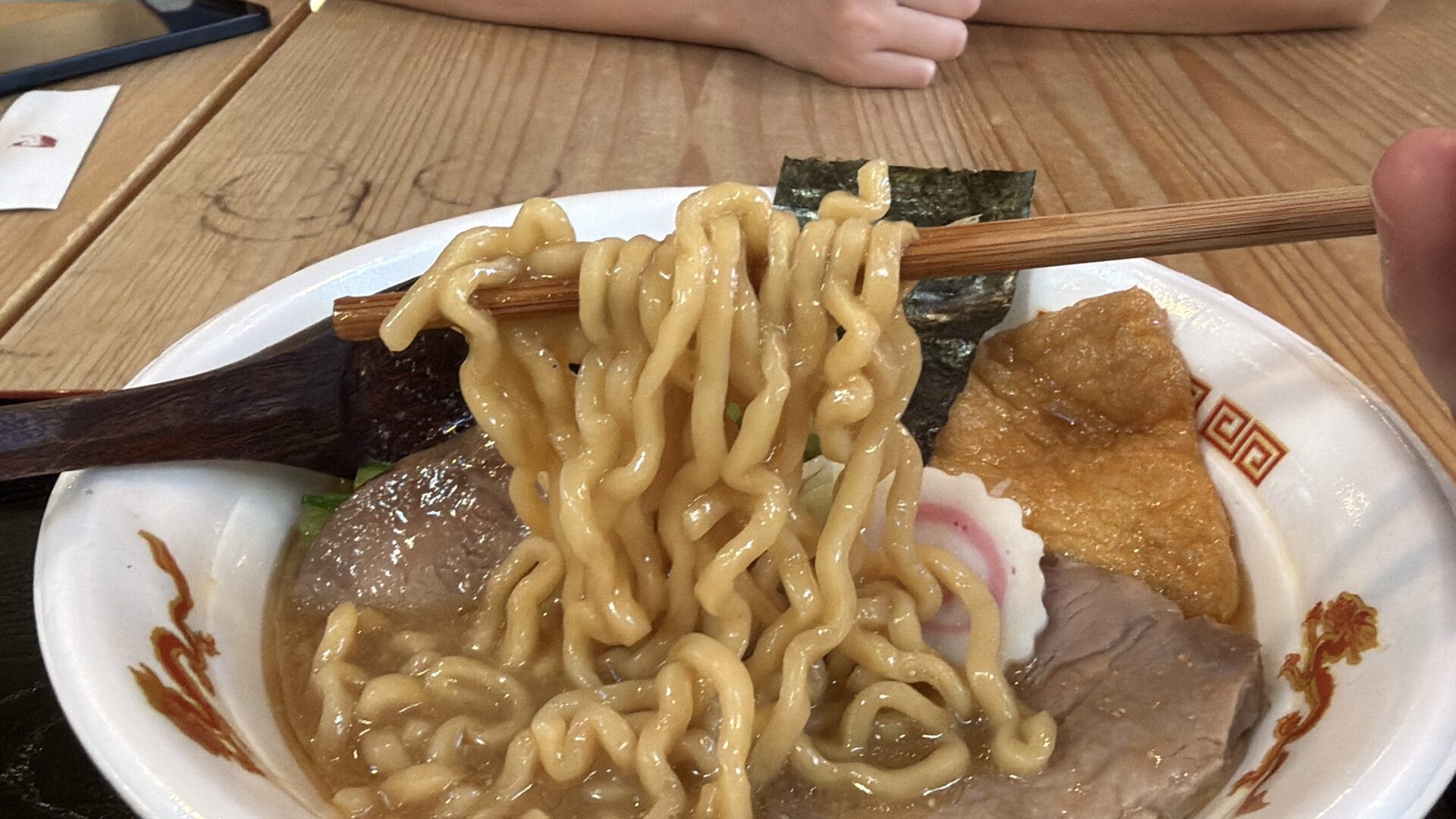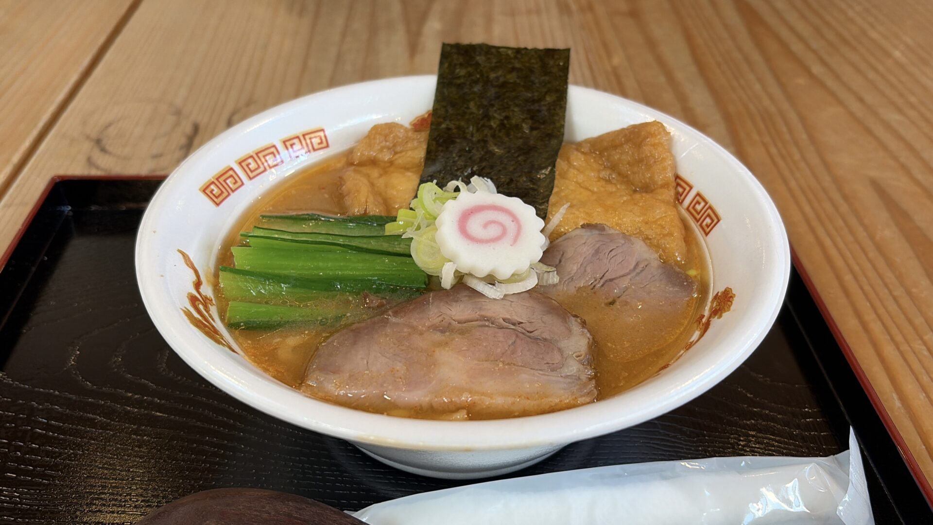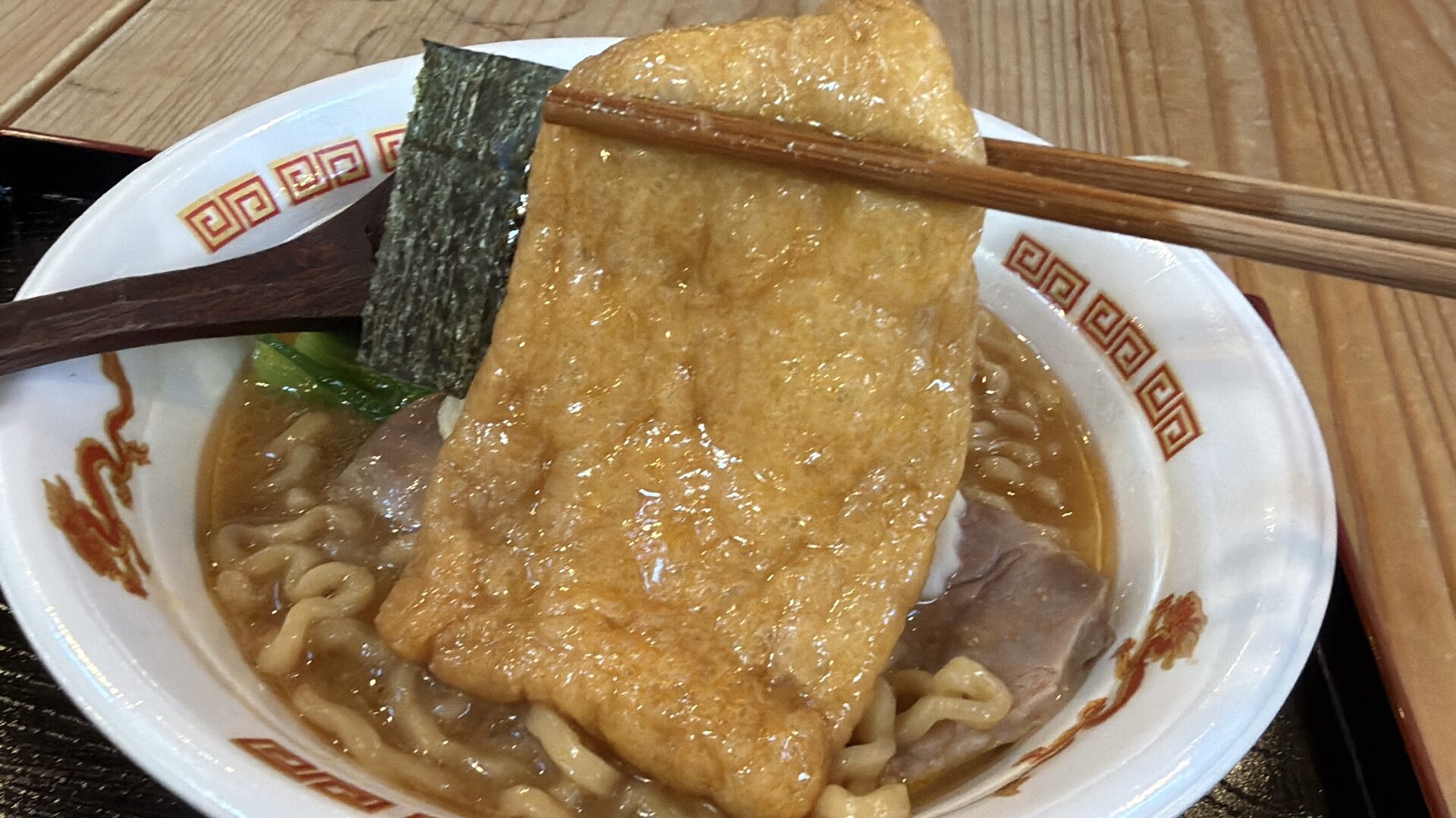 ラーメンに油揚げがありびっくり。